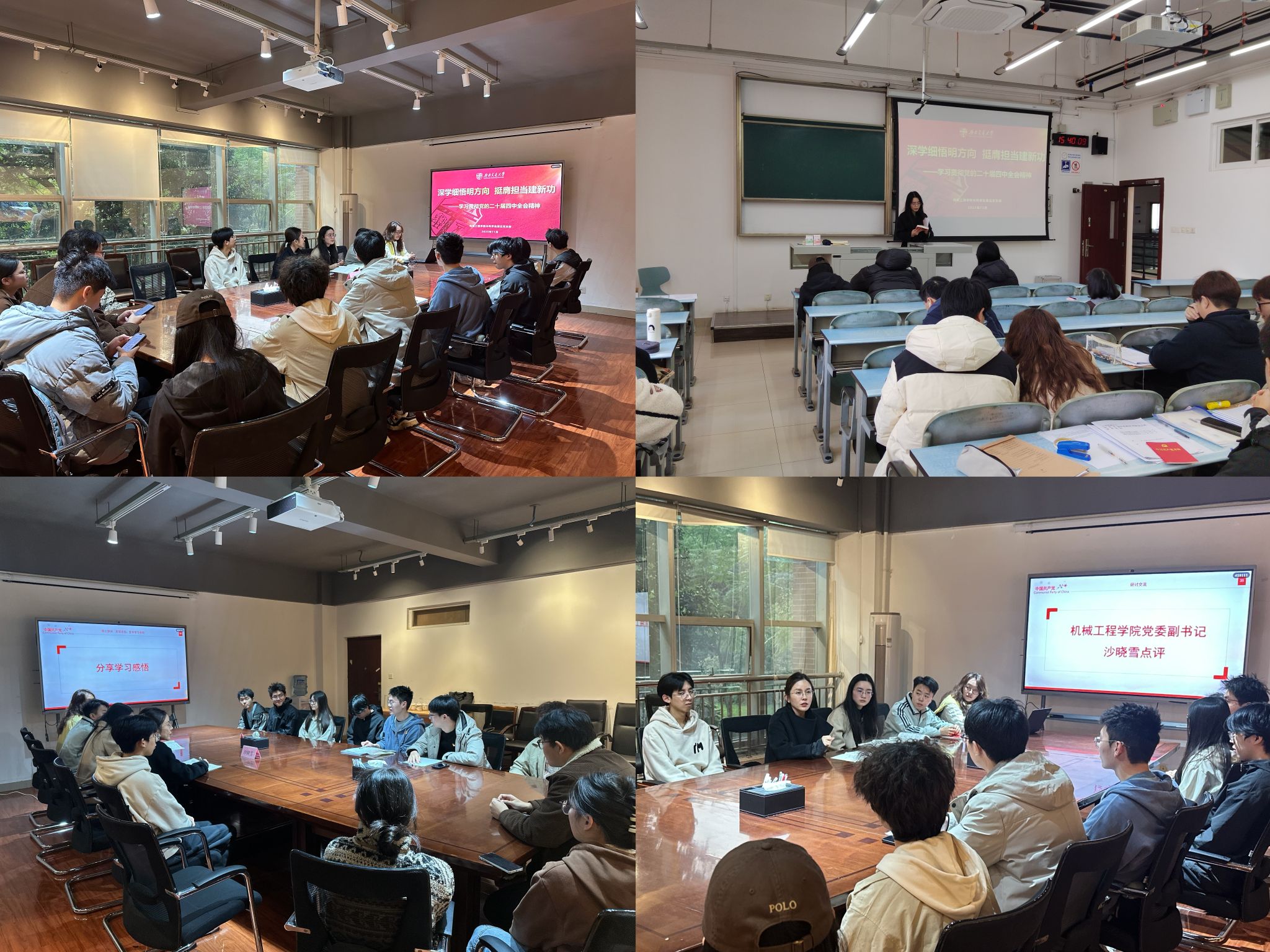 活动伊始,党支部书记带头领学《党的二十届四中全会〈建议〉学习辅导百问》,聚焦“十五五”时期我国发展的历史方位与教育的战略支撑作用,深入解读全会精神对青年学子的时代要求。全体党员结合自身学习成长实际展开热烈研讨,分享如何将全会精神转化为强化学风建设、服务同学成长的具体行动。学院党委副书记沙晓雪对研讨成果进行点评,她强调,青年党员要深刻把握中国式现代化的内涵要求,以“竢实扬华、自强不息”的交大精神为指引,在学风建设中走在前、作表率,让青春在服务国家发展中绽放光彩。