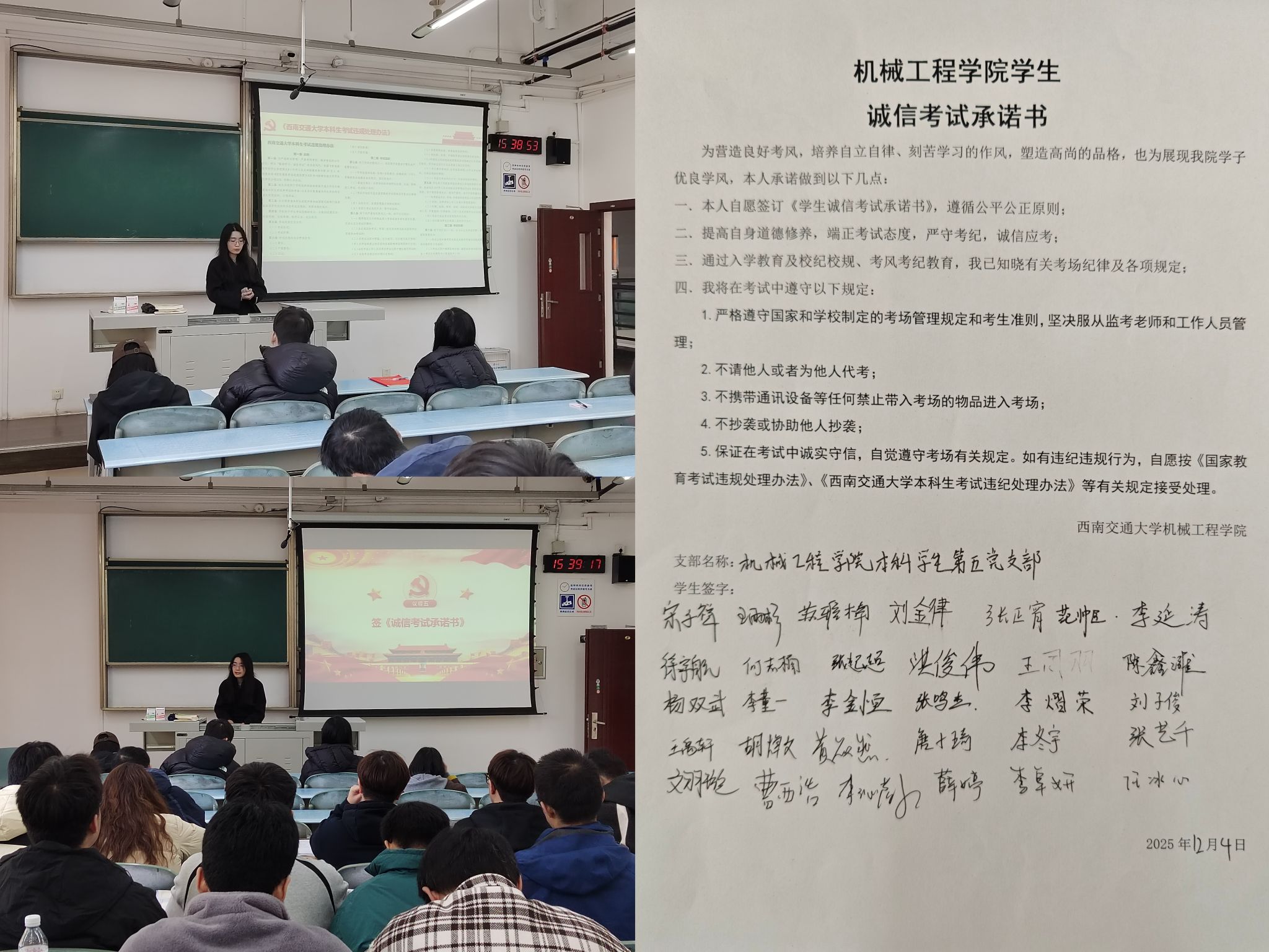 为强化考试纪律意识,营造公平公正的考试环境,党支部书记牵头开展专题学习会,组织全体党员深入学习《西南交通大学本科生考试违规处理办法》《西南交通大学学生纪律处分规定》等文件。学习过程中,大家结合典型案例深刻认识到学术诚信的重要性,明确考试违纪的严重后果,纷纷表示将严格遵守考试纪律,自觉维护学校教学秩序。支部通过“原文学习+案例警示+交流承诺”的方式,引导党员筑牢纪律防线,带动身边同学共同营造“诚信考试、光荣守纪”的良好氛围。最后,支部组织全体党员签订《诚信考试承诺书》,党员们郑重签字、庄严承诺,将自觉遵守考试纪律,坚决抵制作弊行为,以实际行动维护考试公平公正。