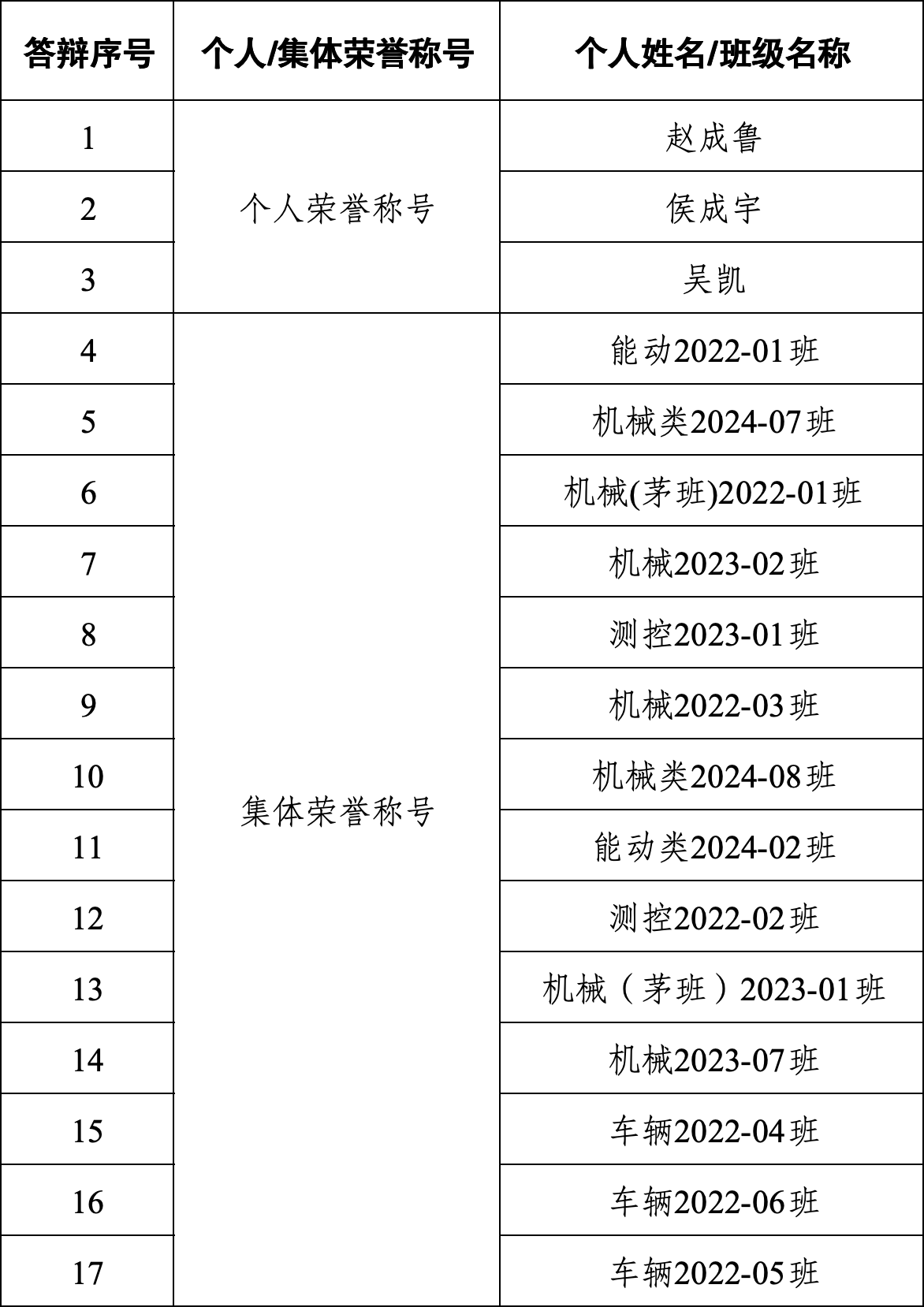为树立典型,表彰先进,培育优良班风学风,促进学生德智体美劳全面发展,学校决定组织开展2024-2025学年本科生荣誉称号评选工作。经学生本人申请、班级民主评议、学院学生工作组审核,机械工程学院共有3名同学申请竢实扬华奖章荣誉称号,14个班级申请班集体荣誉称号。现将答辩事宜通知如下: