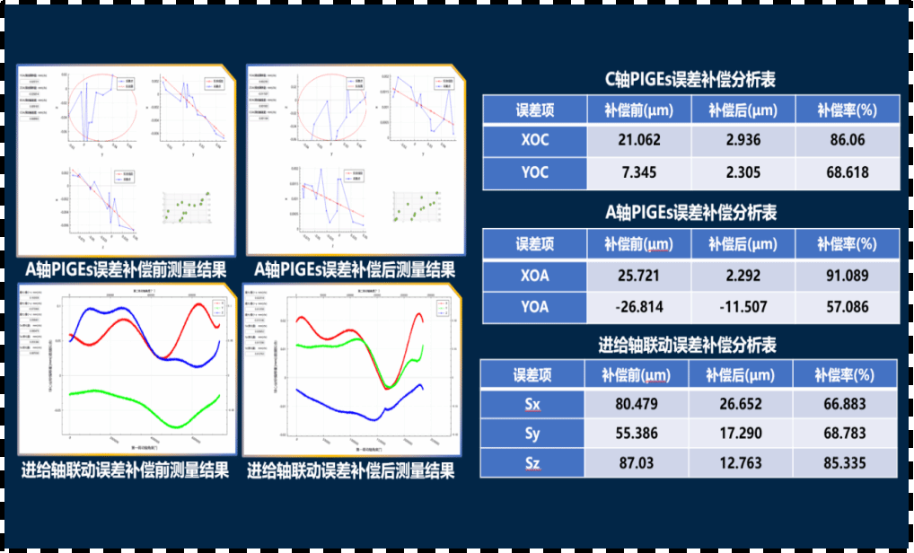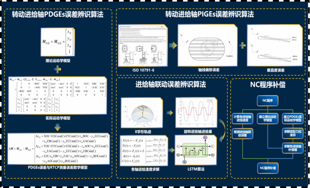 项目简介:本项目从几何误差项完备获取和全面精确补偿入手,开展机床几何误差测量及补偿技术研究。依据几何误差影响机理,提出平动轴四路激光平行同步测量法和旋转轴球杆仪六位置法,实现误差完整测量辨识;从运动轴误差贡献值、误差建模与性质入手,融合指数积理论和坐标系微分运动理论建立机床空间几何误差高精度解析模型;引入反遗机制,提出基于群体优化算法的运动轴运动量动态修正策略并采用雅可比矩车更新位置,进行误差精准智能补偿。