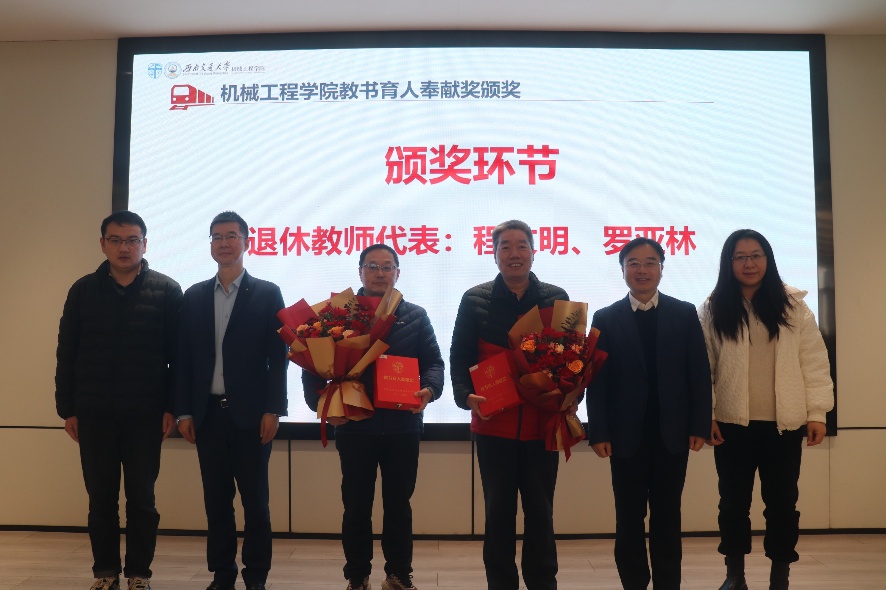 第一阶段首先进行了“教书育人奉献奖”颁奖仪式。袁艳平书记、钱林茂院长为退休教师代表程文明、罗亚林颁发学院定制的“教书育人奉献奖”荣誉奖杯,张敏、罗大兵老师代表系所献上鲜花,以此感谢将毕生青春与智慧倾注于学院人才培养、科学研究和事业发展之中,为学院建设发展奠定基础、作出重要贡献的荣休教师。期盼各位荣休教师退休不褪色、离岗不离志,持续关心支持学院发展建设,发挥余热、建言献策,为学院高质量发展贡献智慧与力量。
