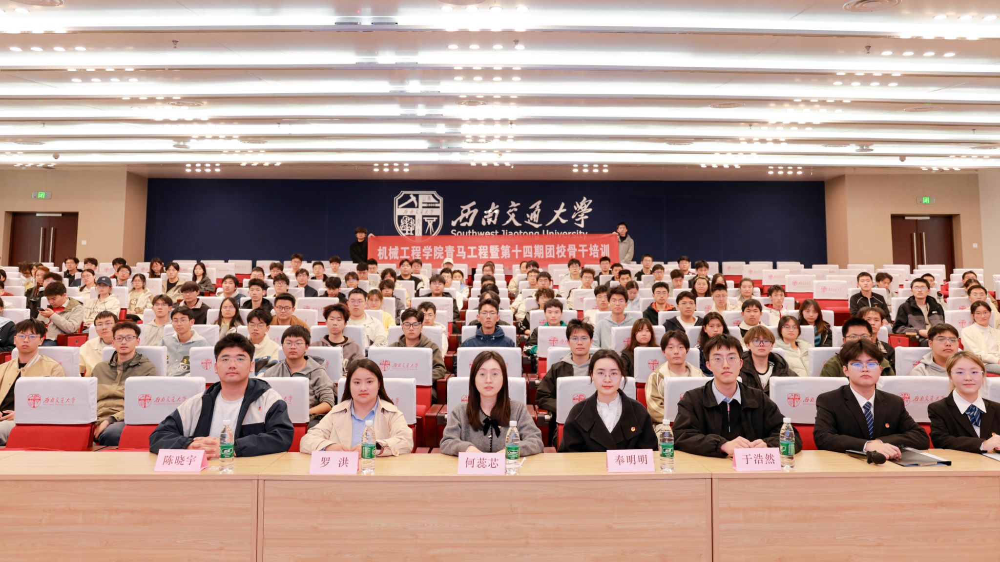 西南交通大学机械工程学院青马工程暨第十四期团校骨干培训结业典礼于2026年3月12日在犀浦校区图书馆二号报告厅隆重举行,标志着本期团校骨干培训圆满落幕。机械工程学院团委书记何蕊芯、团委副书记奉明明、2025级辅导员老师罗洪、团委兼职副书记陈晓宇、团建中心指导老师于浩然等出席本次结业典礼。